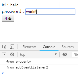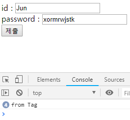 submit 버튼을 누를 경우에 아래 console log에 from Tag가 입력이 됩니다.