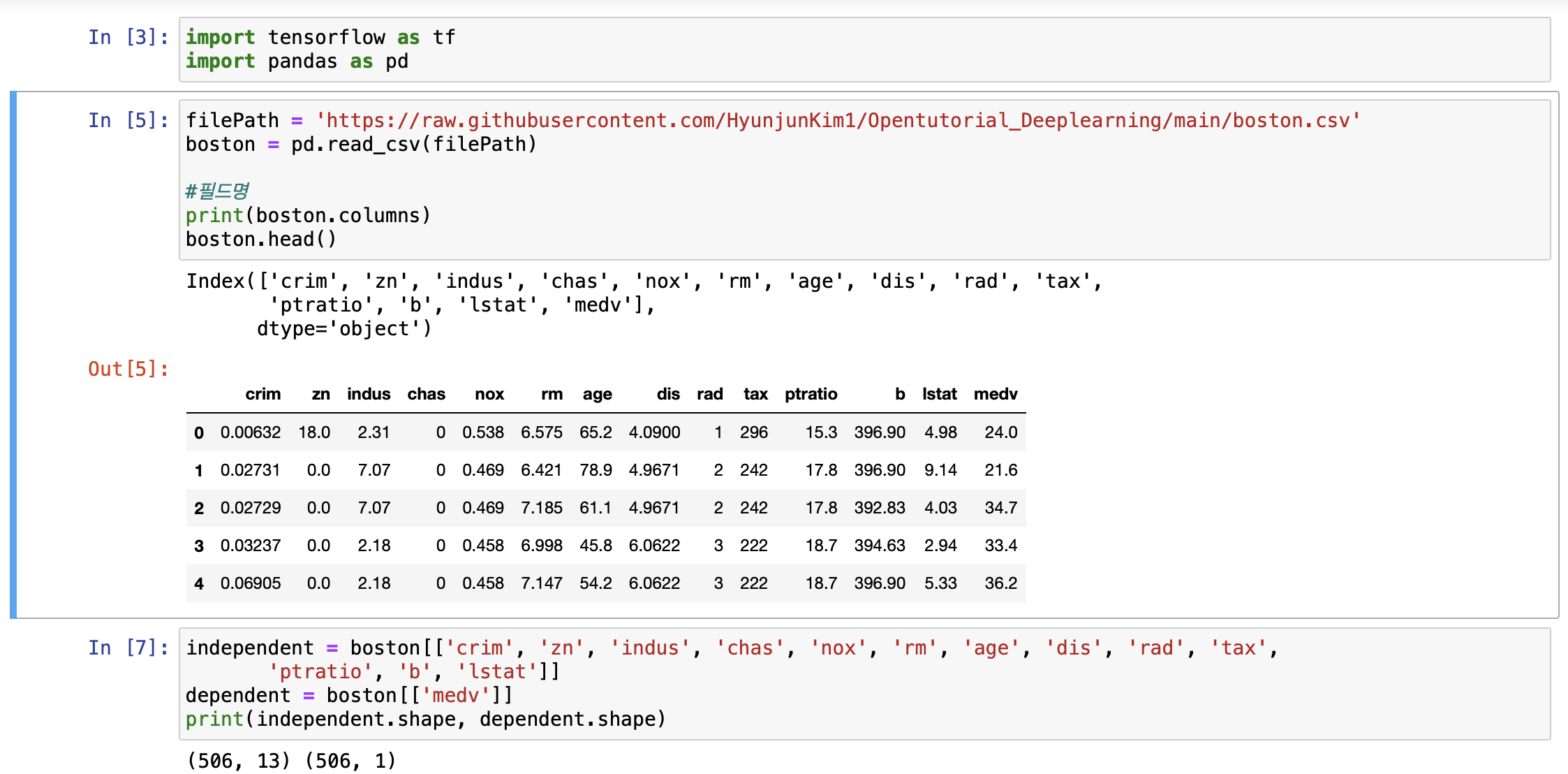 filePath = 'https://raw.githubusercontent.com/HyunjunKim1/Opentutorial_Deeplearning/main/boston.csv'