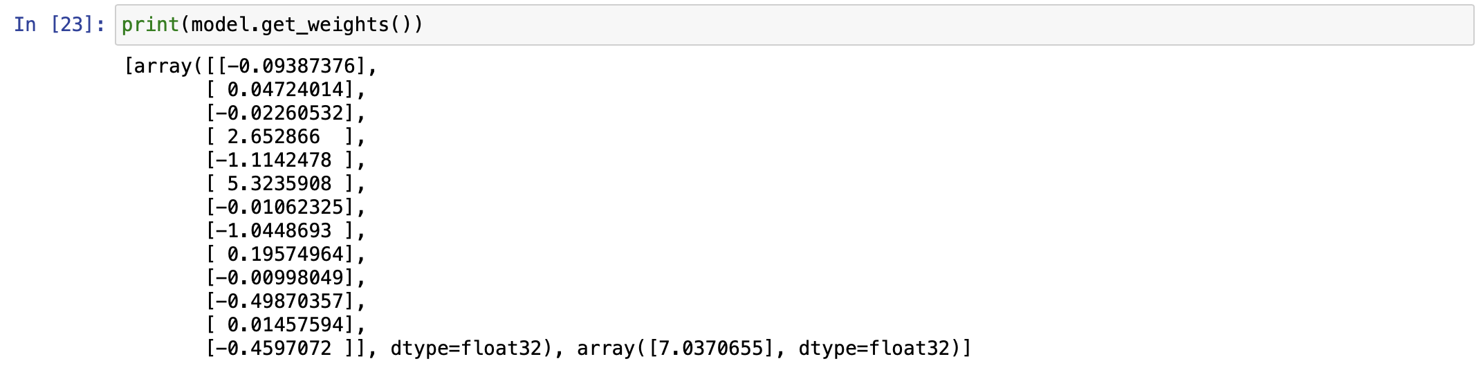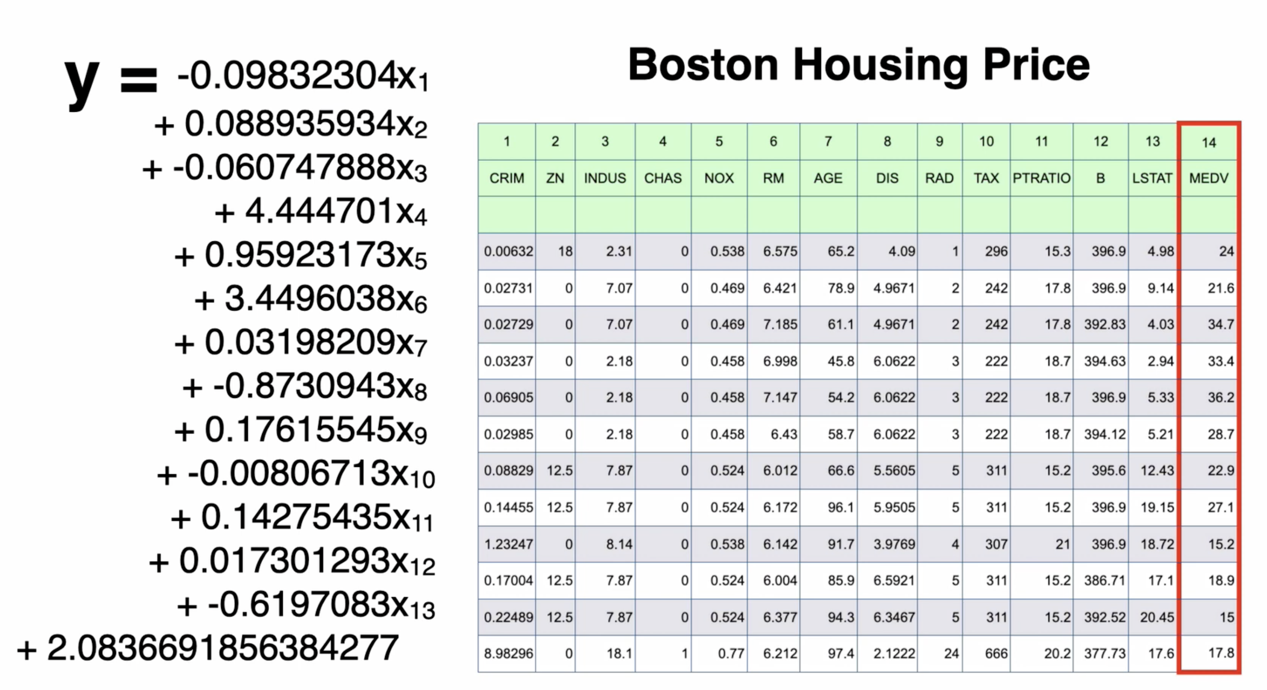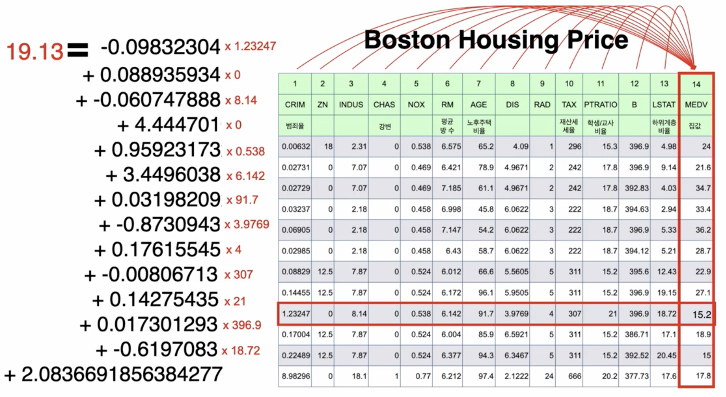 위의 이미지는 1 ~ 13열 까지의 총 13개의 독립변수와 하나의 종속변수를 사용하였을 경우의 공식이다.